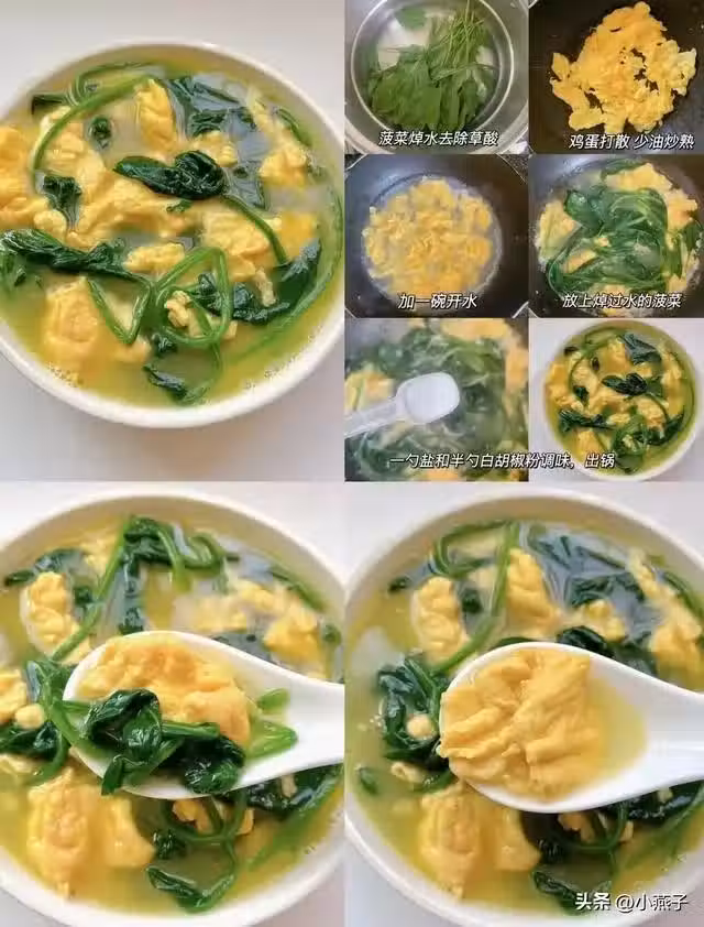 1. 菠菜焯水10秒去草酸,雞蛋煎成蛋花。