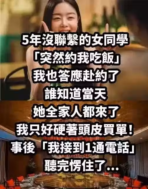 5年沒聯繫的女同學「突然約我吃飯...」,我也答應赴約了,誰知道當天她全家人都來了,我只好硬著頭皮買單!事後「我接到1通電話」聽完愣住了...