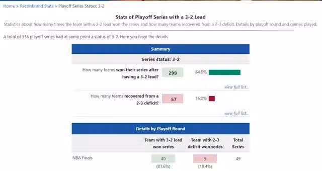 根據NBA歷史來看,2-3落後的球隊在季後賽是299負57勝,逆襲機率只有16%,如果是總決賽則9勝40負,逆襲機率18.4%,不管從哪一方面來看溜馬都是命懸一線,溜馬在G6就失利的機率太高了。