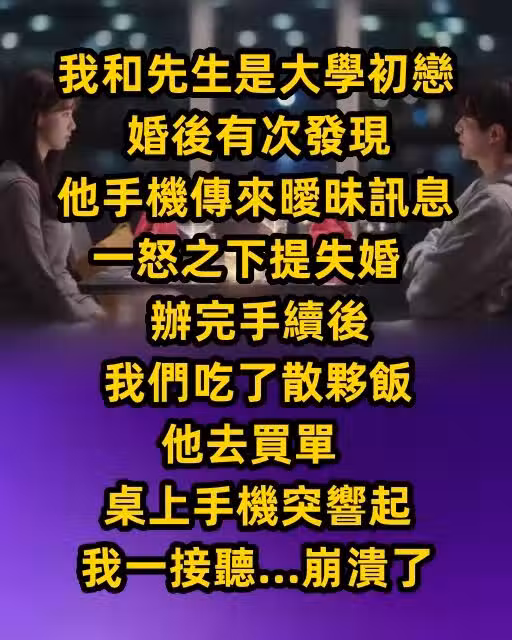 我和先生是大學初戀,婚後有次發現他手機傳來曖昧訊息,一怒之下提失婚,辦完手續後,我們吃了散夥飯,他去買單,桌上手機突響起,我一接聽…崩潰了!