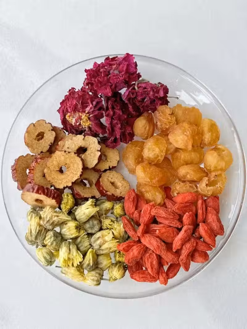 胎菊2克|玫瑰花3克|枸杞2克|桂圓3顆|紅棗2顆