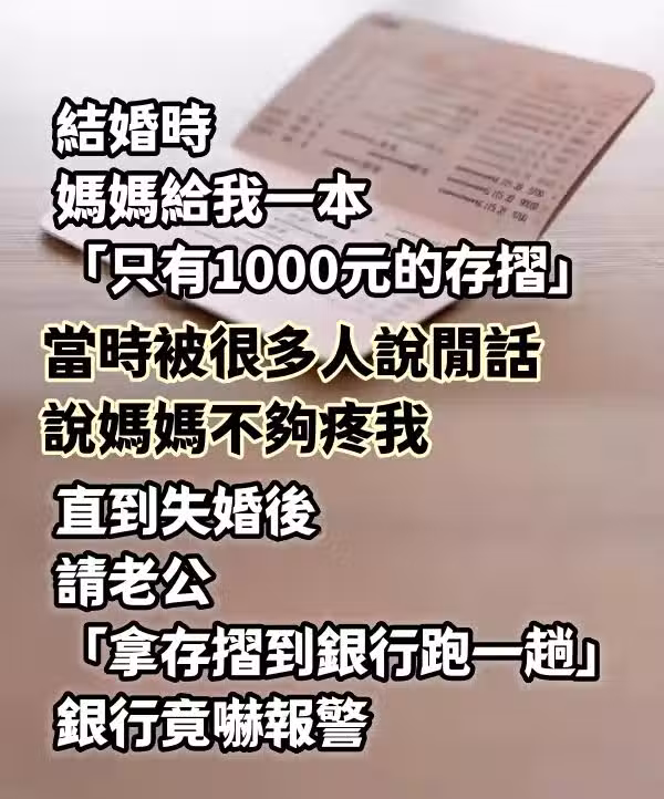 結婚時,媽媽給我一本「只有1000元的存摺...」,當時被很多人說閒話,說媽媽不夠疼我,直到失婚後,請老公「拿存摺到銀行跑一趟」,銀行竟嚇報警