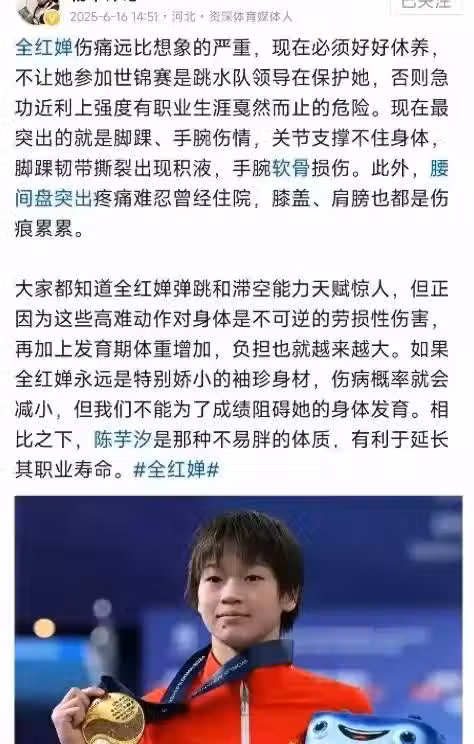 全紅嬋這次缺席世錦賽,傷病和發育期的雙重考驗是主因,身體狀態的變化,讓她需要時間重新打磨動作、找回最佳狀態,曾經刻進肌肉記憶里的完美動作,如今每個細節都需要重新調整,這都是需要時間的,就讓我們靜待嬋寶滿血回歸吧。
