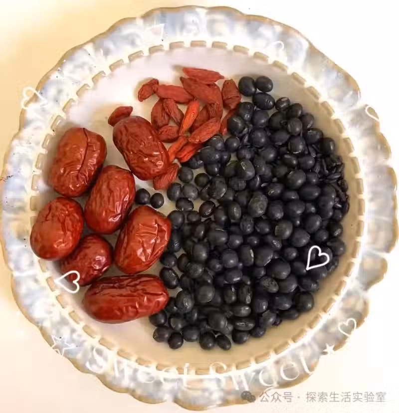 黑豆、紅棗、枸杞各適量、紅糖1勺