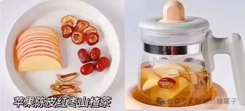 蘋果富含多種維生素和膳食纖維,陳皮理氣,紅棗補血,山楂消食。四者搭配,不僅味道酸甜可口,還能有效改善脾胃功能,促進消化,同時達到美容養顏的效果。