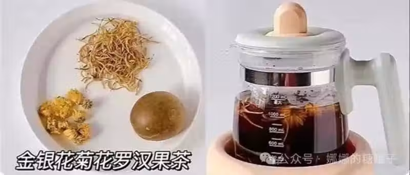 金銀花、菊花清熱解毒,羅漢果潤肺止咳、生津止渴。當你感冒咳嗽,或是喉嚨乾燥疼痛時,喝一杯金銀花菊花羅漢果茶,能有效緩解症狀,讓身體感覺更加舒適。