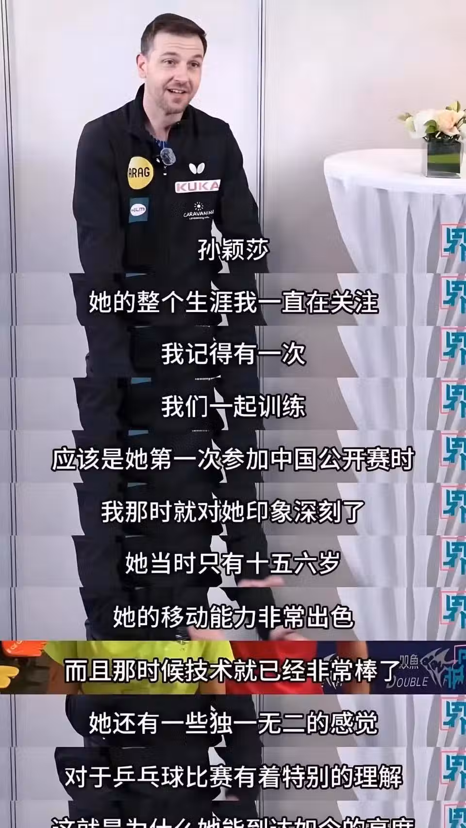 正如波爾書架上那顆見證孫穎莎成長的親手簽名小白球,雖然44歲老將謝幕了,但傳奇從未真正離開,孫穎莎、王楚欽等新生代正在續寫新的故事。球迷們都很好奇,女單世界第一的孫穎莎,除了能給自己滿滿安全感的混雙搭檔王楚欽外,她最想搭混雙的外國球員是誰呢?原來,另一位與莎莎惺惺相惜的人,就是這位與她相差19歲的前輩波爾,孫穎莎曾大方表示「波爾打球太帥了,喜歡看他打球,也是自己最期待搭混雙的外國球員!」