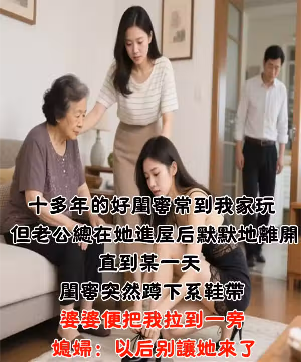我有一個十多年的好閨蜜,常常到我們家玩,但老公總在她進屋後默默地離開,讓我有些疑惑。直到某天,閨蜜突然「蹲下繫鞋帶」婆婆便把我拉到一旁:「媳婦,以後別讓她來了...」