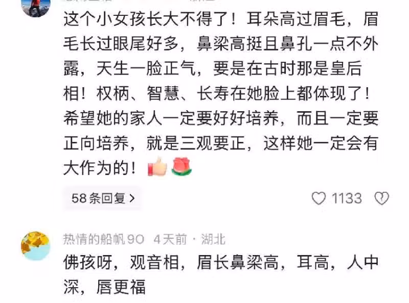 有網友就注意到了這一點,說她耳朵比眉毛高,眉毛又比眼尾長,鼻樑高挺,天生一副正氣模樣,在古代就是母儀天下的「皇后」面相,這家人一定要好好培養她的三觀。