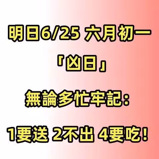 明日六月初一是「凶日」,無論多忙,牢記:1要送,2不出,4要吃!