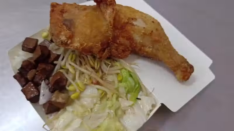 高雄知名便當店,十點多就有人來買午餐了,招牌是雞腿飯必點,現炸雞腿香噴噴,可選三樣青菜,每一份原價115元,特價105元,便宜10塊錢,還不是短期優惠活動,而是老闆佛心來了,雞腿飯降價賣。