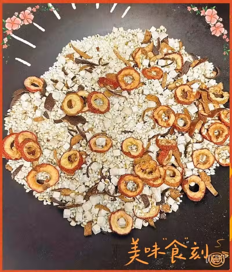 3.喝的時候兩勺米,兩片山楂,用熱水泡十分鐘就可以喝了