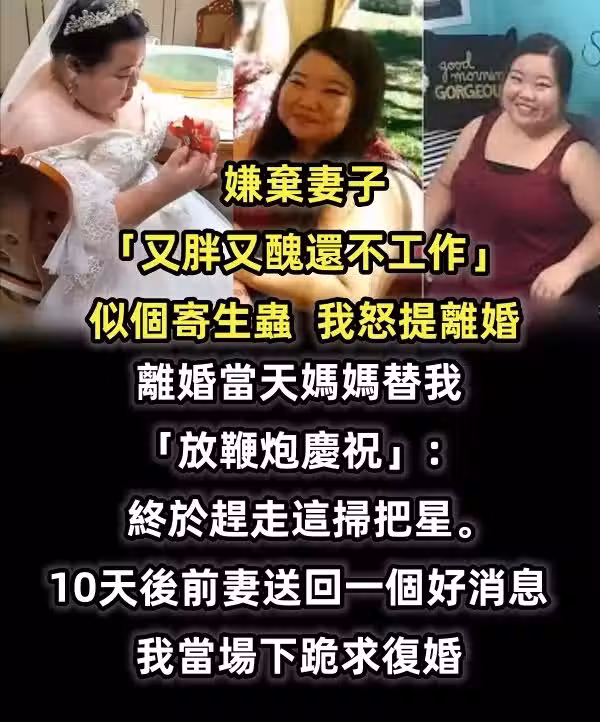 嫌棄妻子「又胖又丑還不工作」似個寄生蟲,我怒提離婚,離婚當天媽媽替我「放鞭炮慶祝」:終於趕走了這個掃把星。10天後前妻送回一個好消息,我當場下跪求復婚