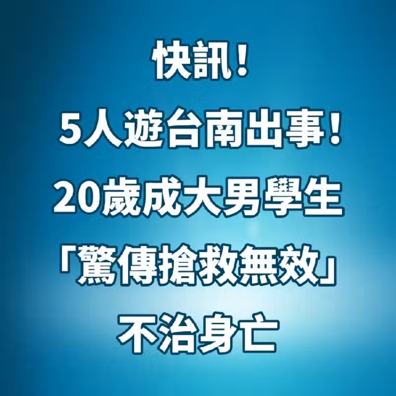 快訊/5人游台南出事!20歲成大男學生「驚傳搶救無效」不治身亡。