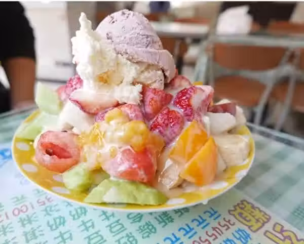 削芒果聲響起,愛文芒果削皮切成塊,圍一圈在牛奶冰球堆成的小山丘旁邊,淋上甜甜煉乳,芒果牛奶冰上桌。