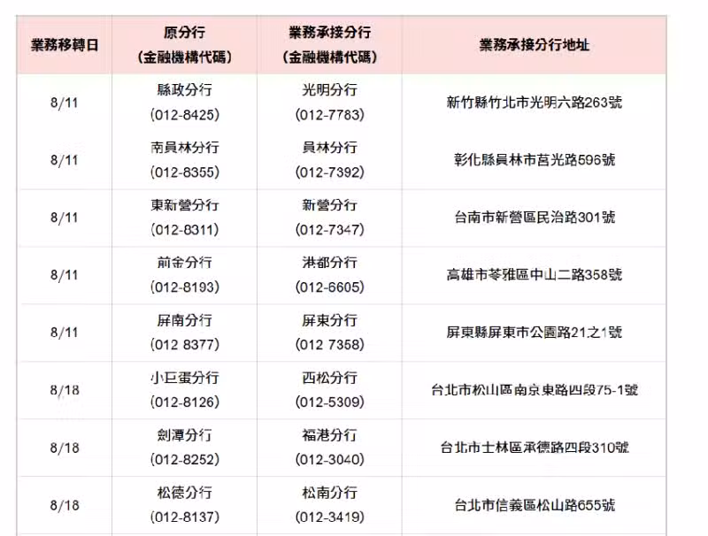 北富銀也宣告,10間分行暫停營業,縣政分行、南員林分行、東新營分行、前金分行、屏南分行,自8月11日起移轉鄰近分行服務;小巨蛋分行、劍潭分行、松德分行、金城分行、光復分行,自8月18日起,移轉由鄰近分行提供服務。