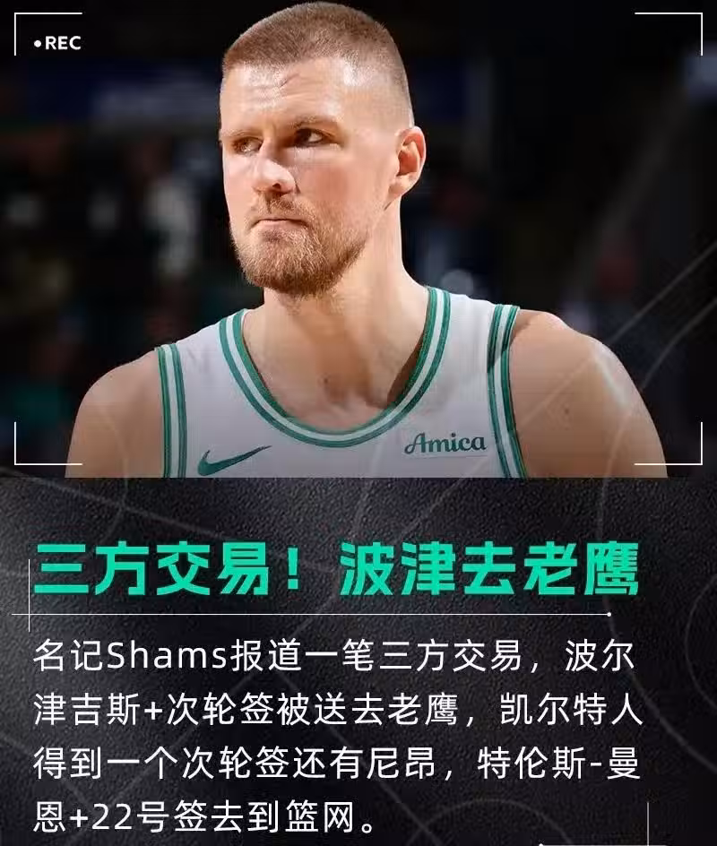 繼凱爾特人將霍樂迪交易至開拓者後,僅不到20小時,他們又達成了一筆三方交易:波爾津吉斯+次輪簽送去老鷹,凱爾特人得到次輪簽和尼昂,特倫斯-曼恩+22號簽去籃網。至此,凱爾特人拆散了2024年總冠軍陣容,節省了2.38億美元。