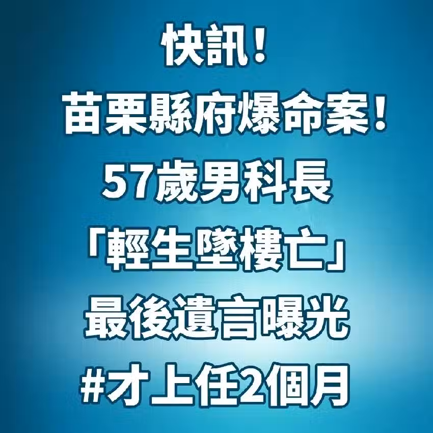 快訊/苗栗縣府爆命案!57歲男科長「輕生墜樓亡」...最後遺言曝光 #才上任2個月