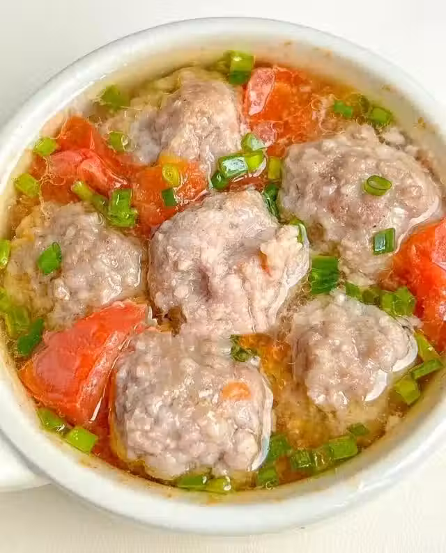 3.番茄鋪碗底放一些油鹽拌一下再把搓好的肉丸放上去再加入適量水蒸20分鐘即可。