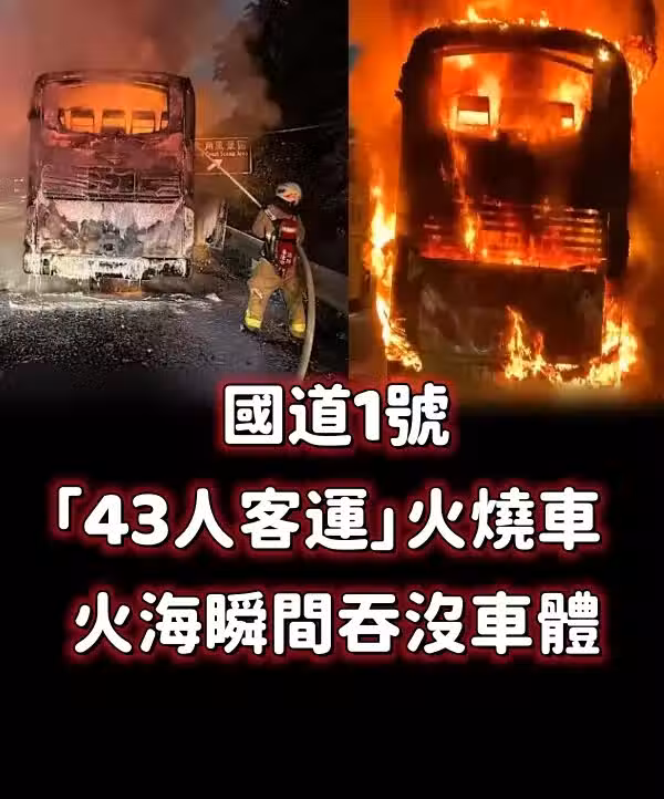 快訊/國道1號「43人客運」火燒車 火海瞬間吞沒車體...