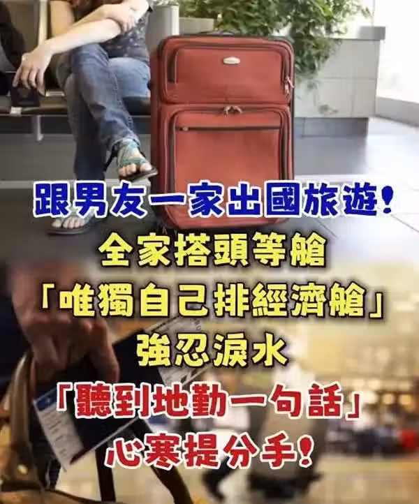 跟男友一家出國旅遊!男子全家搭頭等艙「唯獨自己排經濟艙」 強忍淚水「聽到地勤一句話」心寒提分手!!