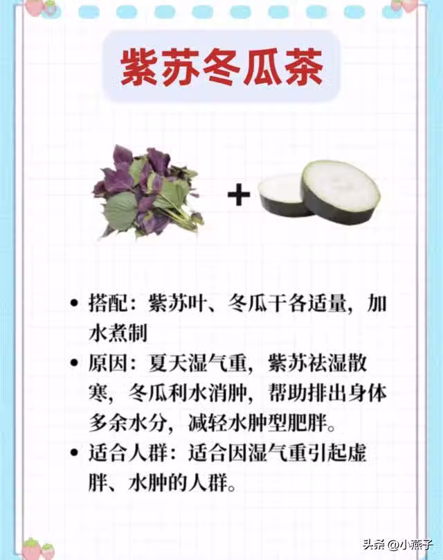 配方:紫蘇葉5g+冬瓜干10g+清水煮15分鐘。