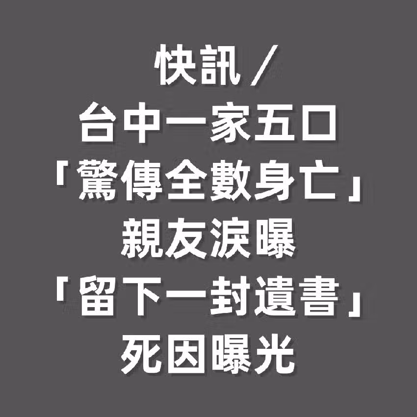 快訊/台中一家五口「驚傳全數身亡」!親友淚曝「留下一封遺書」死因曝光