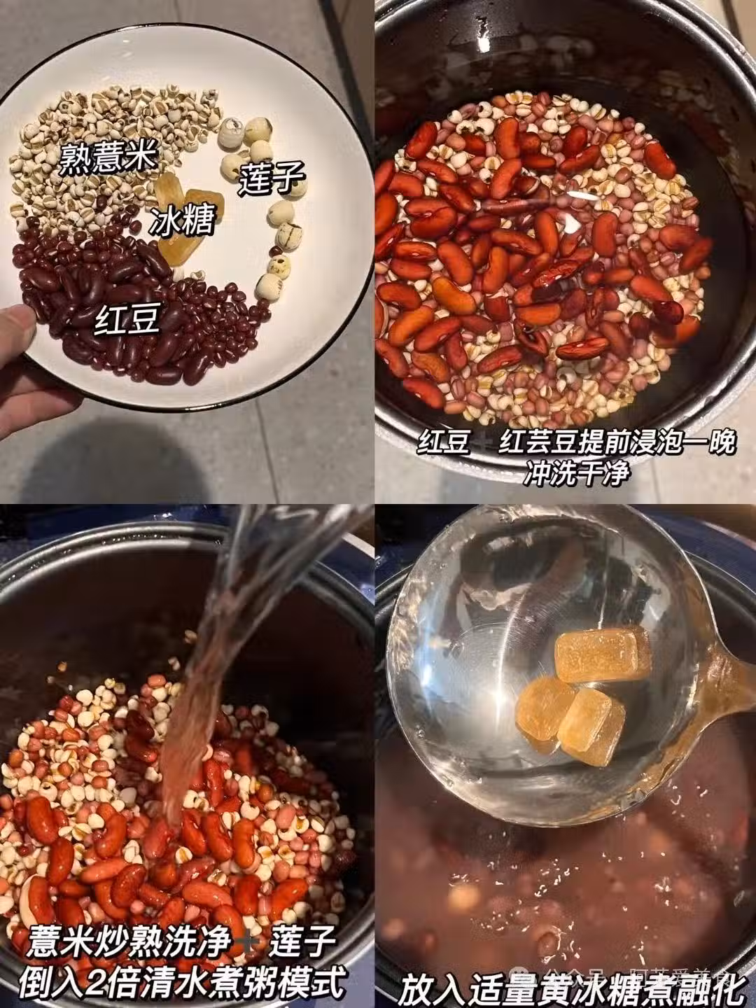 紅芸豆泡一晚,沖洗乾淨。小鍋慢火把薏米炒到微黃,香氣出來再洗凈。蓮子簡單處理一下。所有材料放進電飯煲,加兩倍清水,直接按煮粥鍵。粥快好時丟幾塊黃冰糖進去,攪到融化就行。
