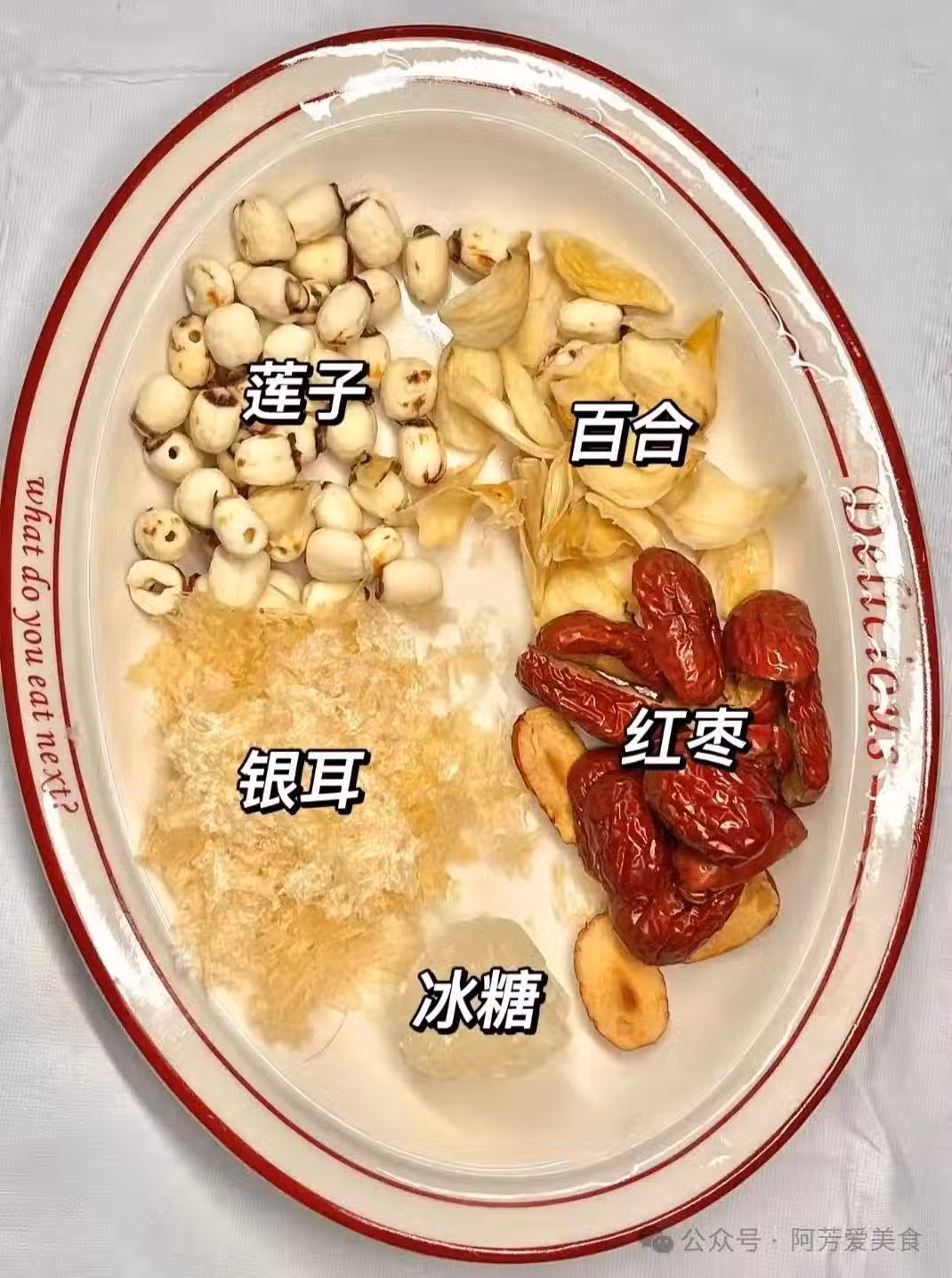 干銀耳10克、蓮子20克、百合15克、紅棗5顆、枸杞3克、冰糖適量。