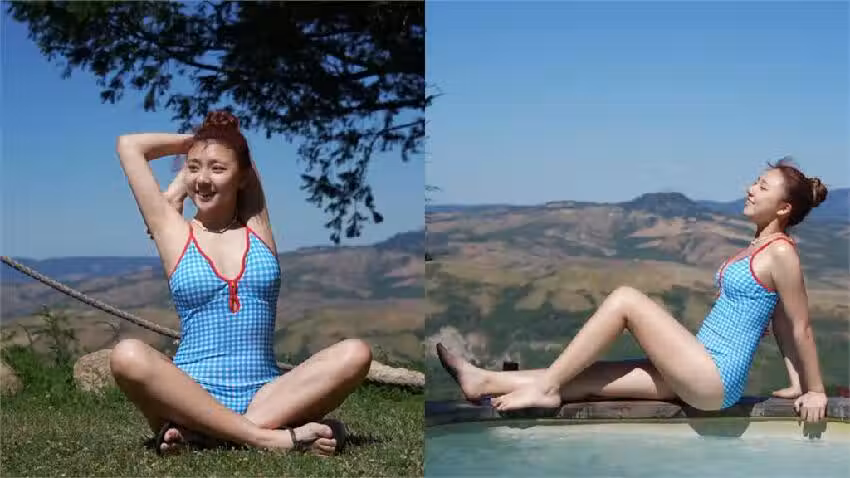 樂樂曬出的一系列美照,可見她身穿一套淺藍色、白色交織的格紋泳裝,在胸前有紅色鑲邊,顯得外型十分活潑可愛,坐在躺椅上的模樣相當愜意,前面深V和挖背的設計讓她的好身材也一覽無遺,有網友則表示,樂樂筆直的雙腿完美遺傳到季芹的好身材,並留言大讚:「美翻了」、「喜歡樂樂青春洋溢的笑容」、「陽光美少女」、「犯規⋯幫我叫救護車(失血過多)」。