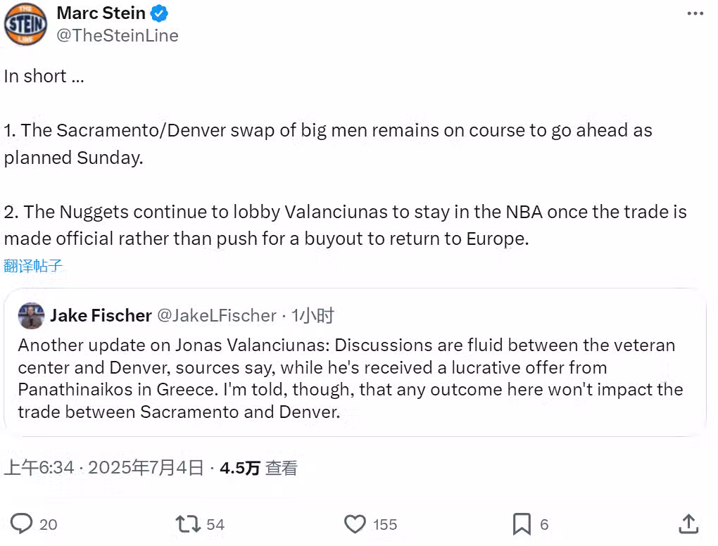 Marc Stein同時表示,不管瓦蘭的決定是什麼,都不會影響國王和掘金的交易:此前掘金將薩里奇送到國王隊,1換1交易得到瓦蘭丘納斯。掘金不會輕易買斷瓦蘭,目前掘金管理層正在說服瓦蘭留在NBA,新賽季給約基奇打替補。