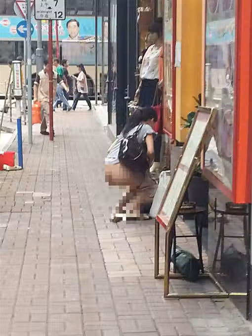 ▲女子不顧人來人往,直接蹲下就地解放,拉出一條「黃金」。(圖/翻攝自香港花生友臉書)