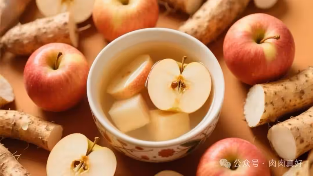 做法:蘋果1 個切塊,山藥 30 克(刮皮切條,山藥片直接煮),加水煮 30 分鐘,煮完讓娃喝水,山藥蘋果也能吃點
