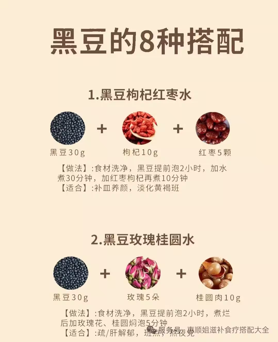 做法:黑豆30g、玫瑰5朵、桂圓肉10g,黑豆泡2小時後煮爛,加玫瑰、桂圓燜泡5分鐘。