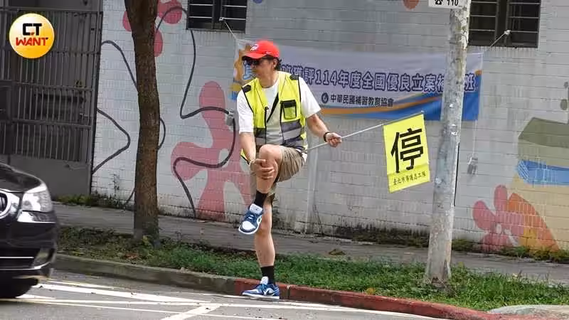 大約在7點50分左右,路口的拒馬移開、車輛放行,接送小朋友的家長們車子陸續開到校門口附近,邱彥翔及其他導護志工們一邊指揮車輛,一邊保障過馬路的學童安全。相較於剛剛低頭滑手機的模樣,此時的邱彥翔眼觀四面、耳聽八方,