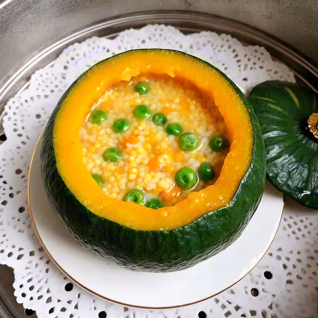 小米50g、南瓜1個、青豆10g、鹽少許。