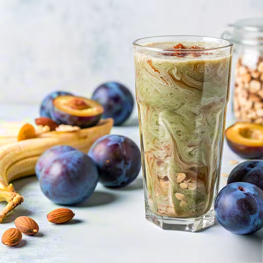 西梅干5顆(或新鮮西梅3顆)、即食燕麥30g、香蕉半根、杏仁奶200ml