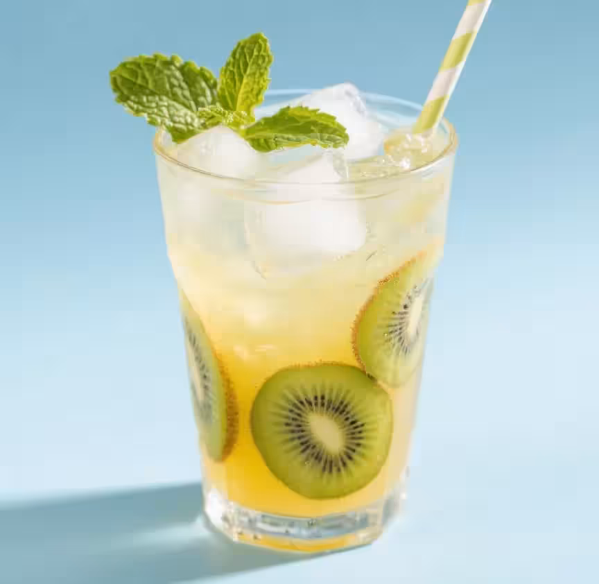 黃金獼猴桃2個、洋槐蜜1勺、薄荷葉3片、蘇打水1罐