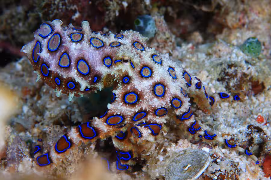 藍環章魚是世界上毒性最強的海洋生物之一,其體內的河豚毒素具有高度危險性。 誤食藍環章魚或其毒液可能導致嚴重的健康問題,甚至危及生命。 一旦誤食,應立即就醫,並在就醫前進行催吐或人工呼吸等急救措施。