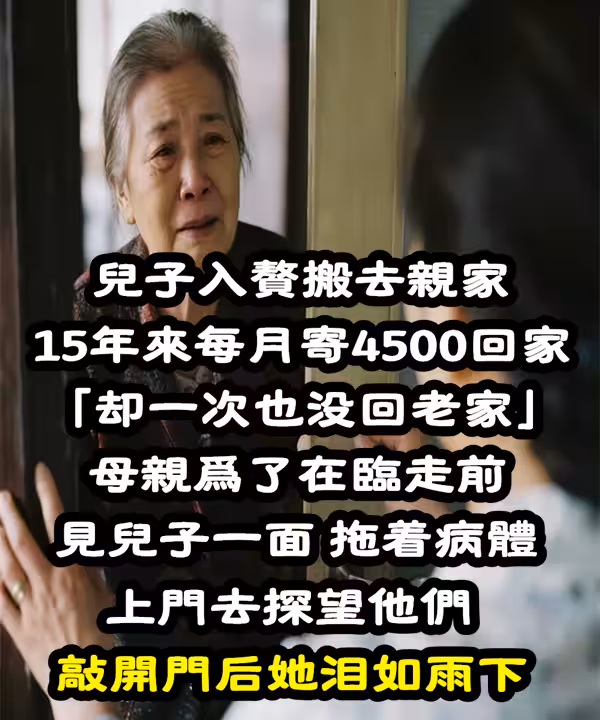 兒子入贅搬去親家!!15年來每月寄4500回家「卻一次也沒回老家」...母親為了在臨走前見兒子一面,拖著病.體上門探望「敲開門她淚如雨下」