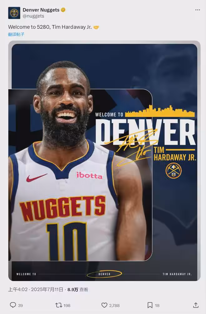 7月11日上午,掘金官方宣布,球隊正式簽下小蒂姆-哈達威。根據此前報道,這是一份1年363萬美元的老將底薪。小哈達威此前的合同是4年7500萬美元,今年夏天到期。他出生於1992年3月16日,33歲的年紀也不算大。