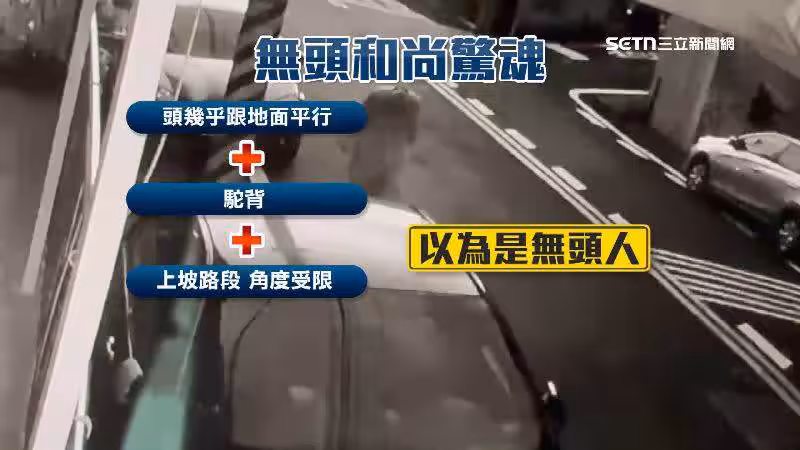 仔細看頭部角度幾乎與地面平行,加上駝背嚴重,剛好這路段又是上坡,駕駛角度問題才以為是無頭鬼啦!