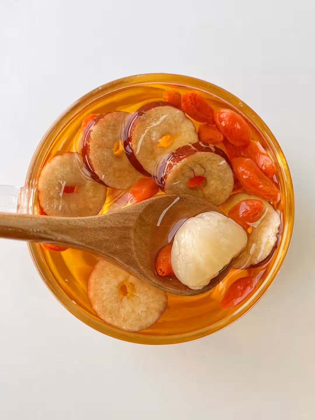 配料:黃芪5片,桂圓5顆,紅棗干2個,枸杞10粒,麥冬5粒;如果覺得不夠甜,桂圓/紅棗/枸杞可以適量增加。