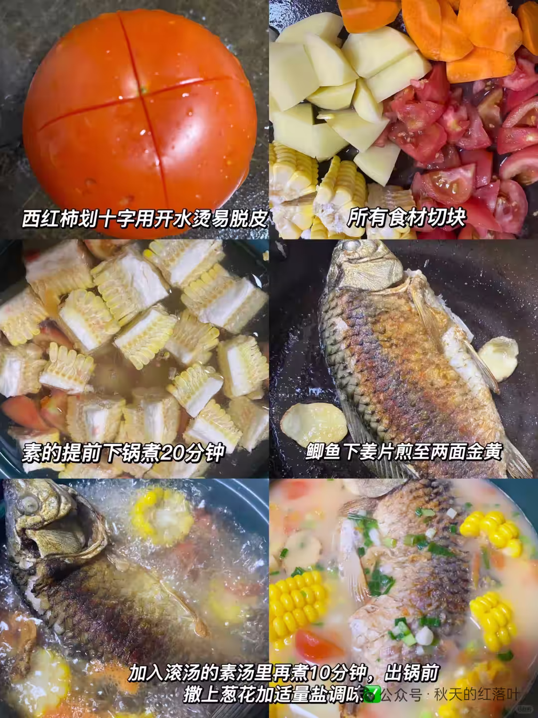 【做法】鯽魚清洗乾淨,西紅柿切十字用開水燙易脫皮,土豆、胡蘿蔔削皮切塊,玉米砍小塊