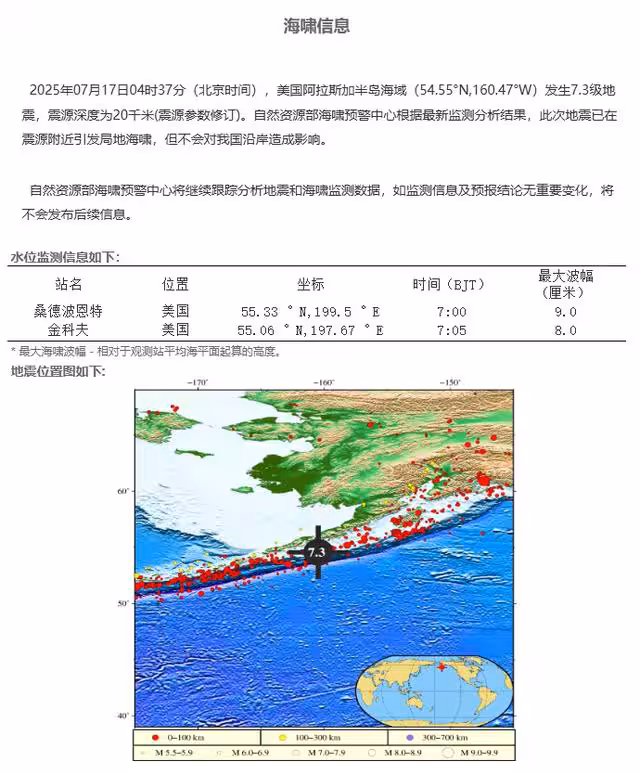 據中國地震台網正式測定,北京時間7月17日4時37分(當地時間7月16日9時37分)在美國阿拉斯加州以南海域發生7.3級地震,震源深度20公里,震中位於北緯54.55度,西經160.70度。