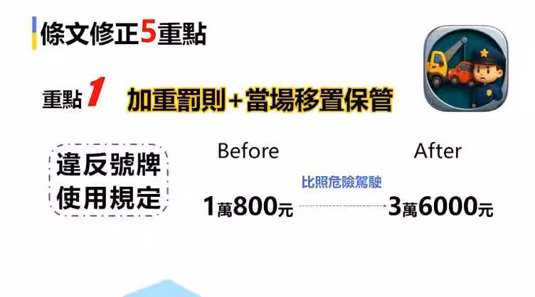 特別值得注意的是,此次修法新增並罰機制。 若駕駛人明知車輛的車牌有問題仍執意上路,也將被處以最高3萬6000元的罰款。