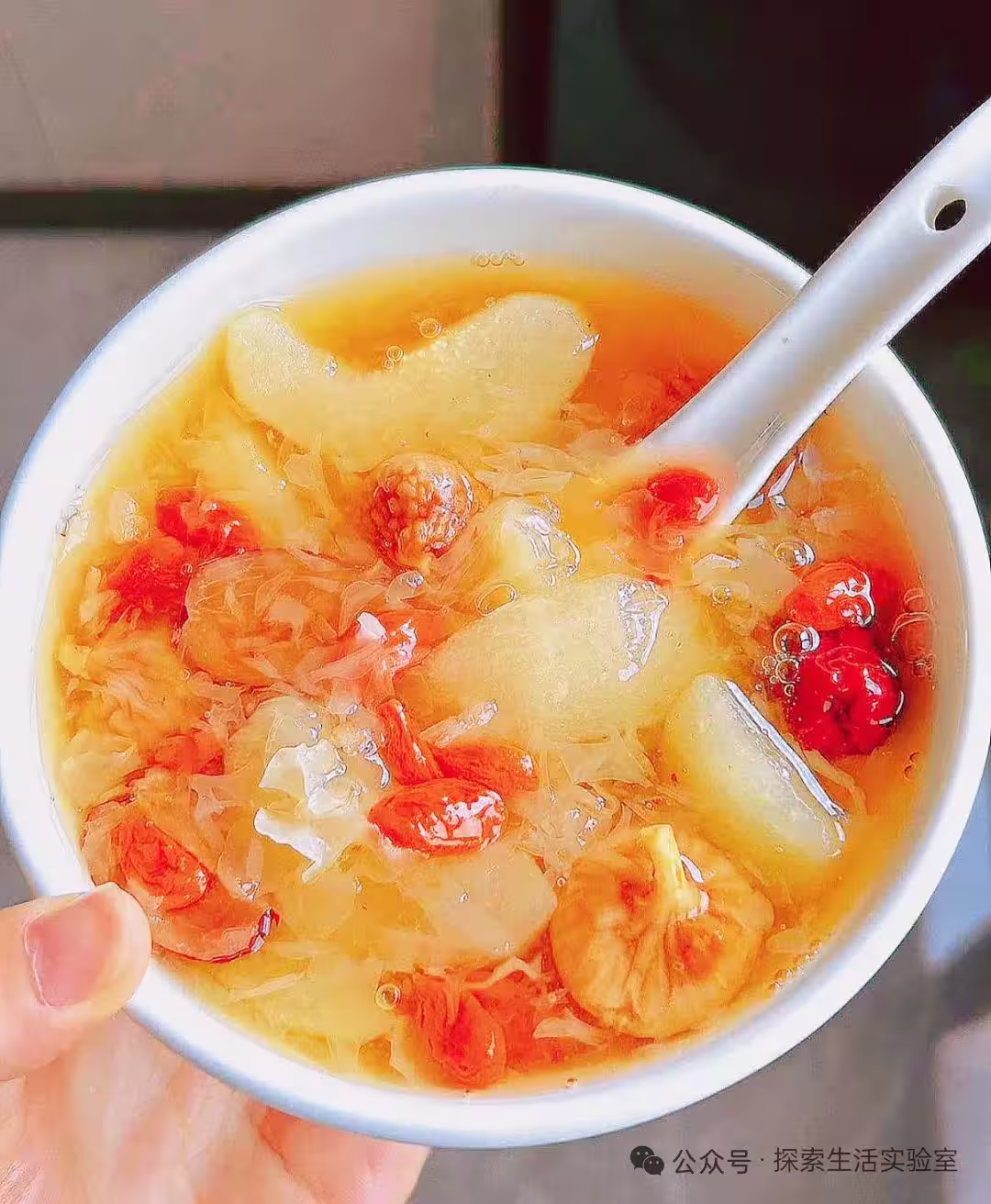三伏天吃不下油膩的,喝這個最解膩。無花果甜甜的能開胃,像咱們做了紅燒肉、炸丸子,吃著膩了,喝兩碗這個,立馬覺得舒服;這湯無花果吃起來軟軟的,帶點自然的甜,銀耳黏糊糊的,湯稠稠的,喝著像甜品。銀耳潤得很,對嗓子好。