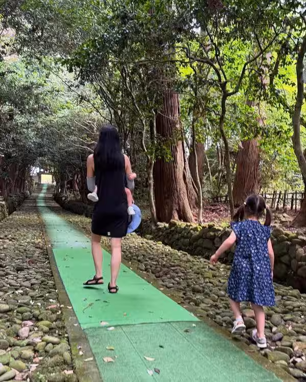 雖然照片僅能看到孩子們的背影,仍可看出4歲的"小米妮"留著長發,身高已及母親腰部。1歲的"米奇"站在姐姐身旁,正伸出小手指向遠方,與姐姐一同欣賞落日餘暉。