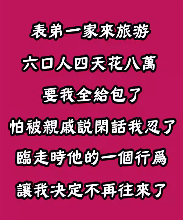表弟一家來旅遊!六口人「四天花八萬」要我全包...怕被親戚說閒話我忍了,臨走時「他的一個行為」讓我決定不再往來!