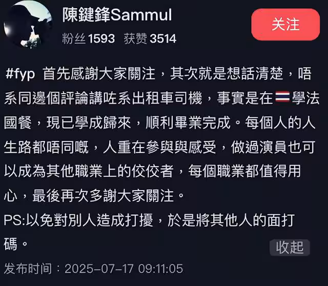 他在發文中表示,自己並沒有從事這一職業,而是專心學習法國料理,現在已經學成歸來。他還強調,無論做什麼工作,都應該用心對待,因為每個職業都有它的價值。